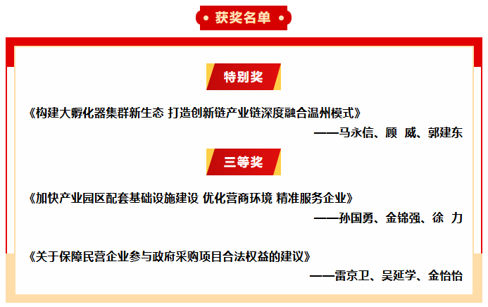 近日,中共温州市委统战部公布了2025年度“诤友建言”调研活动优秀成果评选结果。九三学社温州市委员会报送的3篇调研成果获奖,其中,由我司副总经理郭建东主笔完成的《构建大孵化器集群新生态,打造创新链产业链深度融合温州模式》荣获“特别奖”!