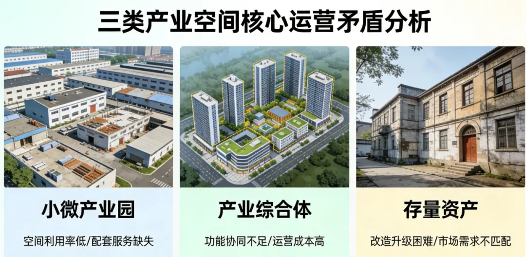 结合实际调研与服务案例,我们发现,小微产业园、产业综合体、存量资产三类场景,普遍面临结构性运营矛盾,制约资产价值发挥。